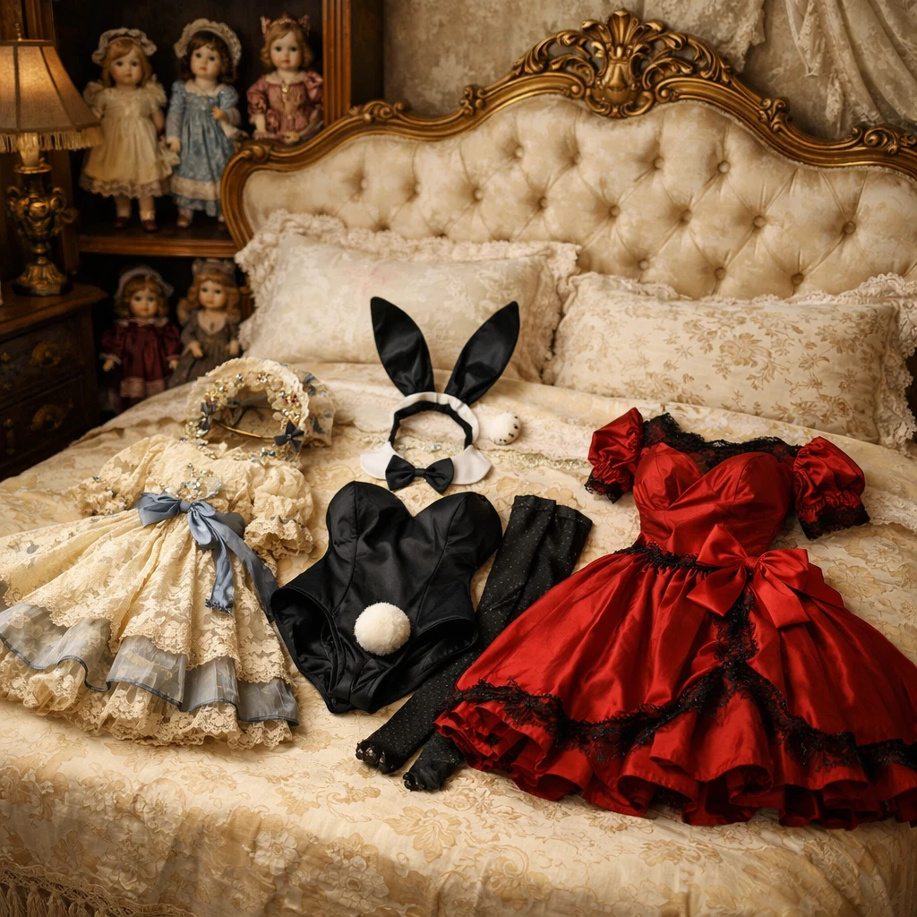 レースの多いアンティークドレス。 深い赤のドレス。 そして、黒いバニーのような衣装まで、どれも、人形に着せるには妙に“意図”を感じるものばかり、まるで、誰かに着せるために選ばれたかのように