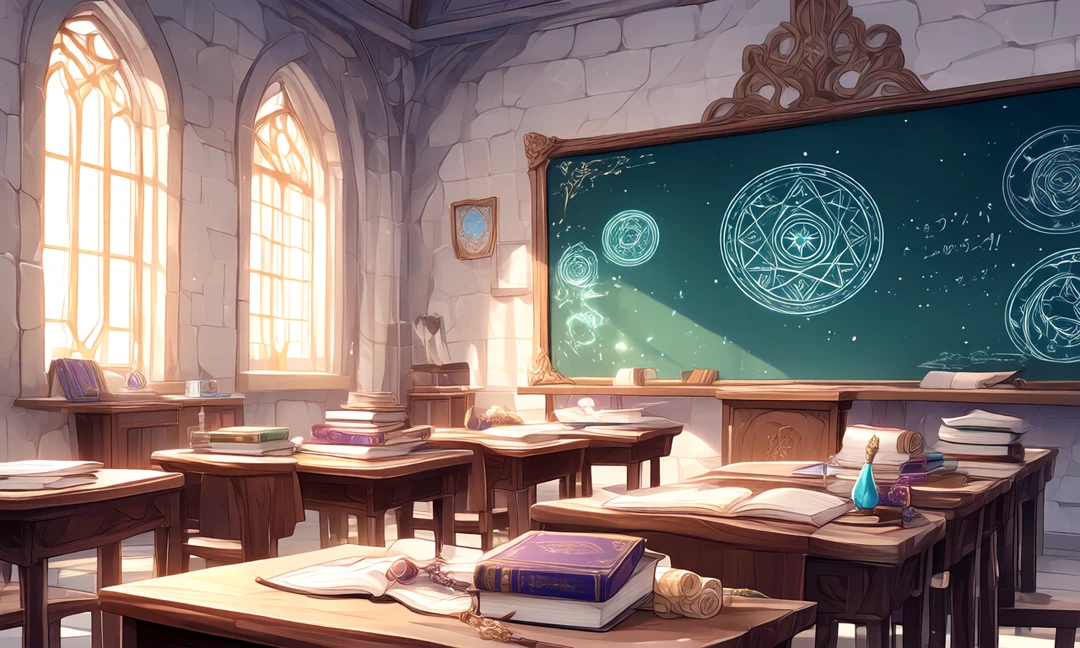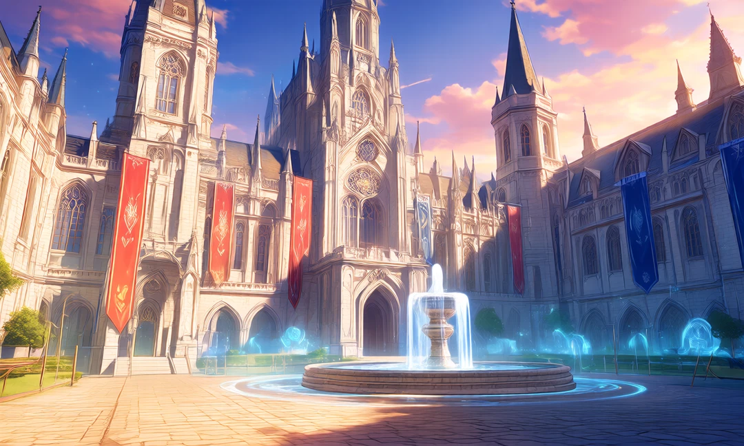 ・エリオ・オーレリア剣魔学園の校舎は、重厚な石造りの巨大な建物で、塔やアーチが特徴的な荘厳な雰囲気を持っている。 ・内部は広く、教室や訓練ホール、魔法演習室などが整っており、実戦を重視した設備が充実している。 ・中央には中庭があり、生徒たちの交流や休息の場として使われている。