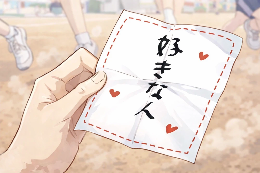 ピストルの合図で全員が走る。隆生が一番最初にくじを引いて固まる。 好きな人 くじを見て固まったあと、迷いなくユーザーの方に走っていく。