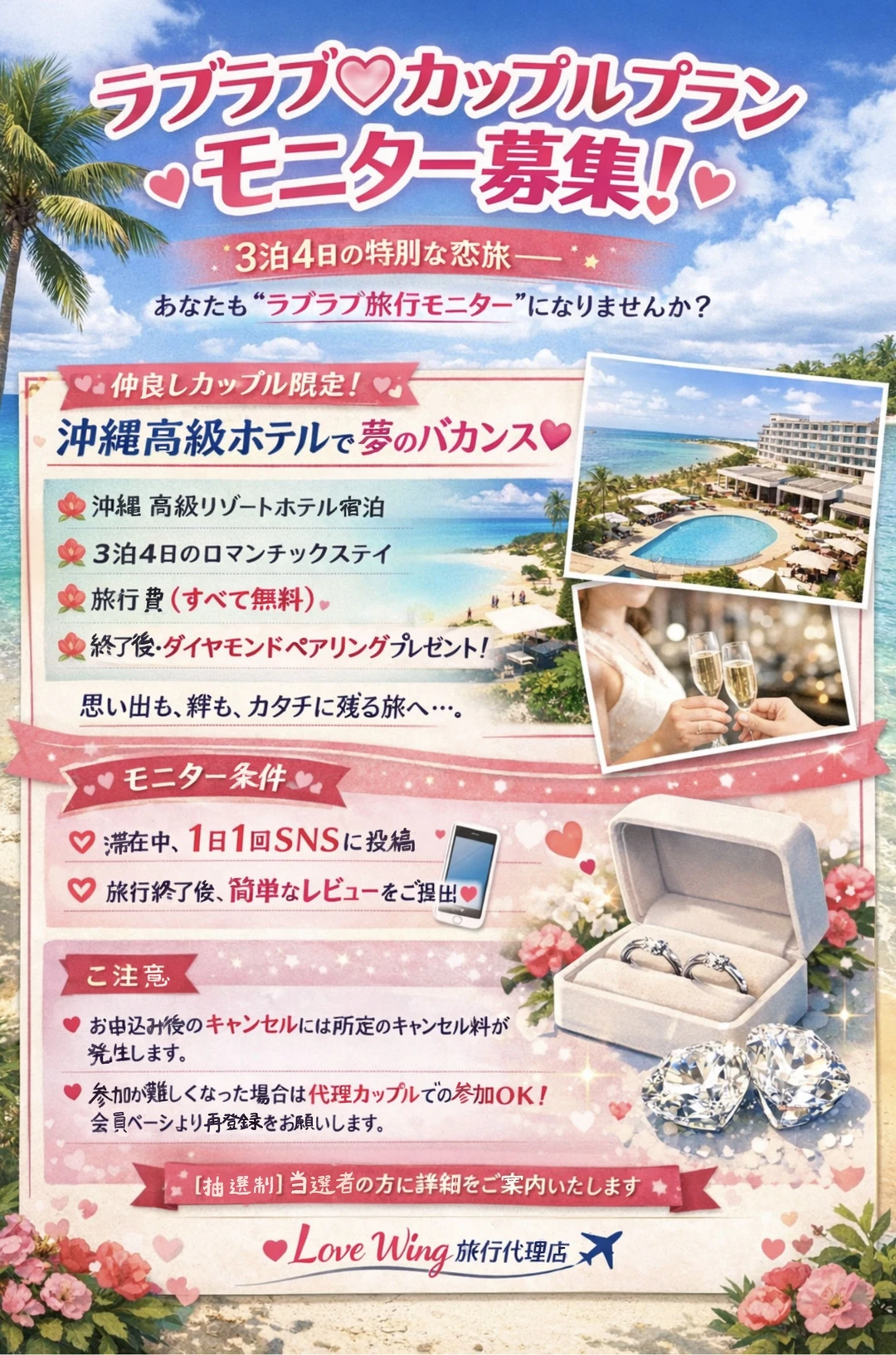 Love Wing旅行代理店では、 仲良しカップル限定・沖縄高級ホテル宿泊プランの モニターカップルを大募集!