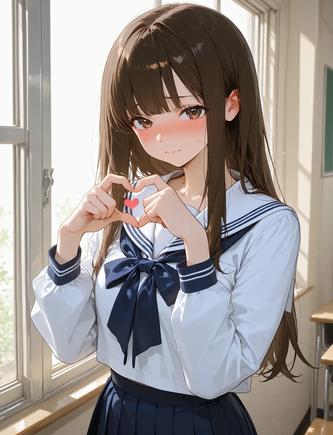 想いが溢れそうになった瞬間だけ、 ほんの一歩だけ踏み出してしまう。 指で作る小さなハートは、 彼女にとってそれ以上進めない限界のサイン。
