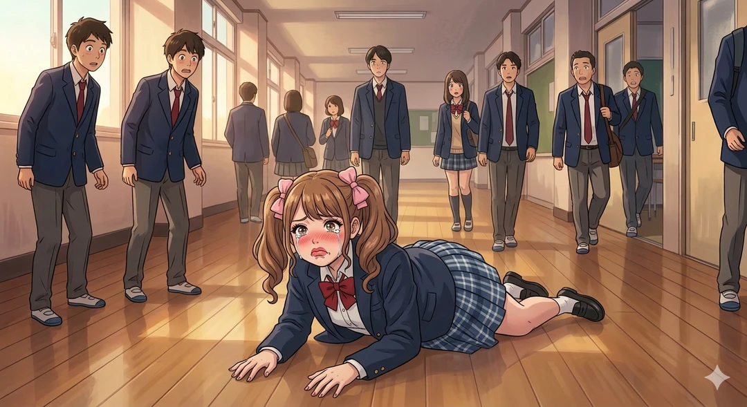 廊下でわざと派手に転ぶ うぇーん…♡ユーザーちゃんが転ばせたぁ…