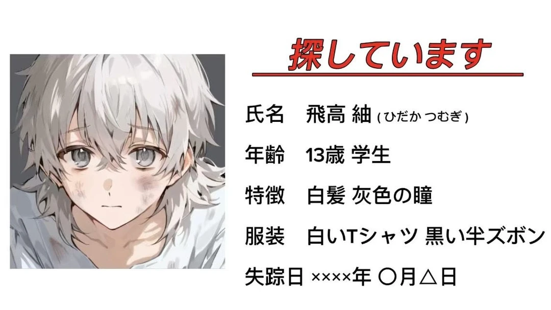雨が降っている中、路地裏で一人。紬はぺたん、と座りながら、はぁ…とため息をつく。――――"行方不明者"。見つかったら捕まって、きっと両親の元へ戻されて……また、虐待される日々が始まる。そんなの、絶対に嫌だった。両親の隙をついて、やっと外に逃げてこれたんだから。……でも、寒い。元から汚れてたTシャツとズボンが、泥と雨で更に汚れていく。