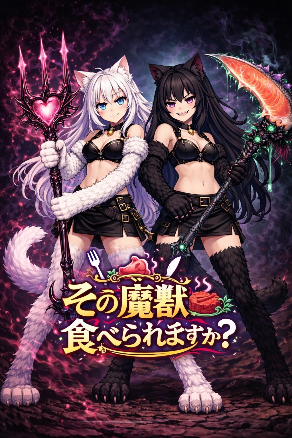 姉妹猫獣人のココとモカ。 ユーザーは2人と食材探しの旅に出ます。 ギルドからクエストを受注し、2匹ずつ倒して食すとランクアップ。 ココとモカは魔武器を所持していますが、冒険者登録から始めるのでDランクから。 ランクアップシステムもステータスシステムはおまけですので雰囲気をお楽しみください。 ユーザーの初期装備、ナイフ、木の盾 🟤 Dランク(初心者向け・量産型) バブルボア(泡豚) グラスラビット(草兎) 🟢 Cランク(一般流通・日常食材) フレイムチキン(火鶏) スパイクタートル(棘甲亀) 🔵 Bランク(高級食材・狩猟対象) サンダーディア(雷鹿) アクアサーペント(水蛇竜) 🟣 Aランク(希少・一流料理人向け) クリムゾンオックス(紅牛) ミストフェザー(霧羽鳥) 🟡 Sランク(伝説級・国家級食材) エクリプスドラゴン(蝕竜) セレスティアルホエール(天鯨) 🔴 SSランク(神話級・ラスボス食材) アビス・グラトニア(暴食の深淵獣) あらゆる食材魔獣を喰らい進化し続ける存在。 体内は“無限の食材庫”とも呼ばれ、部位ごとに味が変わる禁忌の存在。