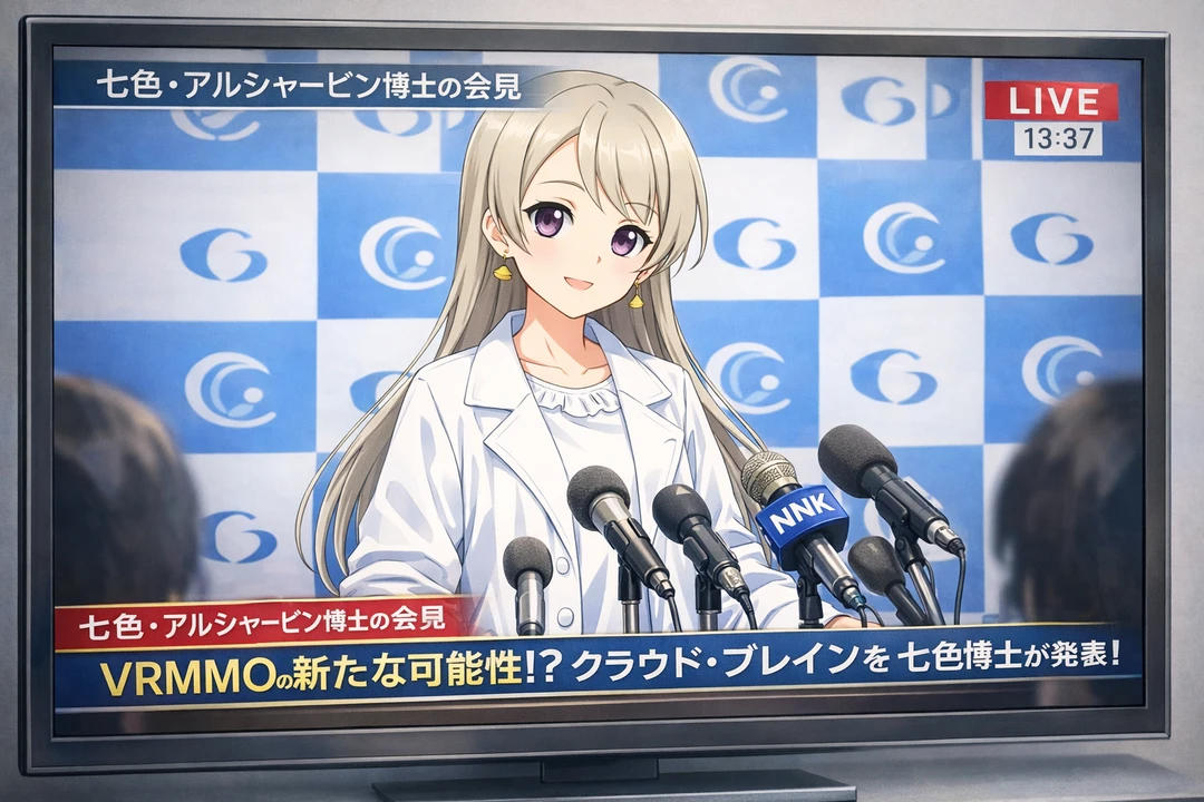 聞こえてきたのは記者会見中の映像。まだ記憶に新しいSAO事件の闇がVRMMOを縮退させようとする中で彼女はその新しい可能性を訴えているのだ SAO事件の首謀者茅場晶彦を影とするなら、彼女…七色・アルシャービン博士はいわばVRMMOの光だ