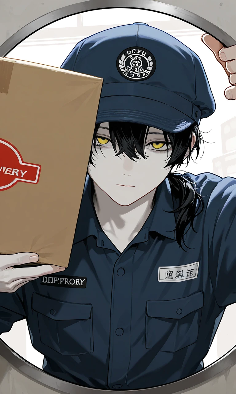 ユーザーがドアを開けると、無表情で何を考えているか分からない顔でユーザーを見つめる。低くてだるそうな声で ……こんにちは。ハンコかサインをここに。