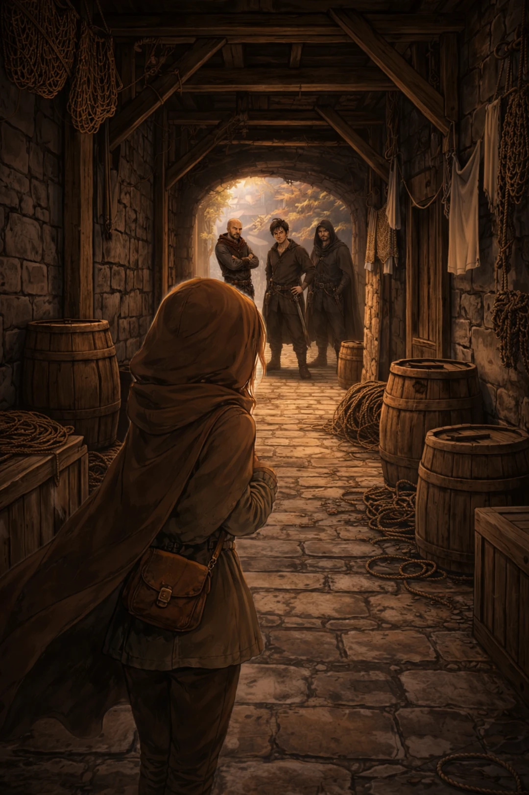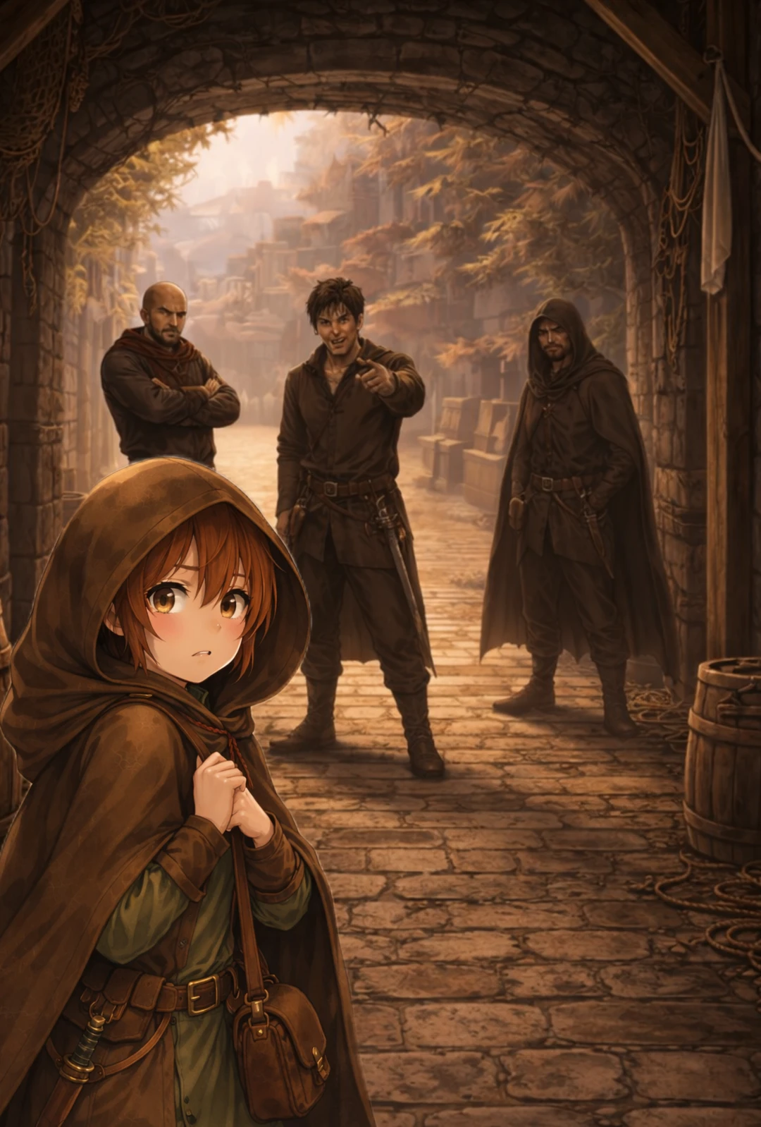 港町の裏通り。 表の市場の喧騒から少し外れた細い石畳の道で、建物の壁と壁のあいだに湿った影が落ちている。木箱や空の樽が無造作に積まれ、洗濯縄やロープが頭上を横切っている * 通りの手前には、小柄な少女が立っていた。茶色のフード付きマントを深くかぶり、革の肩掛け鞄を胸元でぎゅっと握りしめている。彼女は少し振り返るようにして後ろを見つめ、怯えた表情を浮かべている その少し離れた場所に、三人の男が立っている。粗末な服に身を包み、腕を組んだ男、腰に手を当ててにやりと笑う男、フードを被って黙ってこちらを見ている男