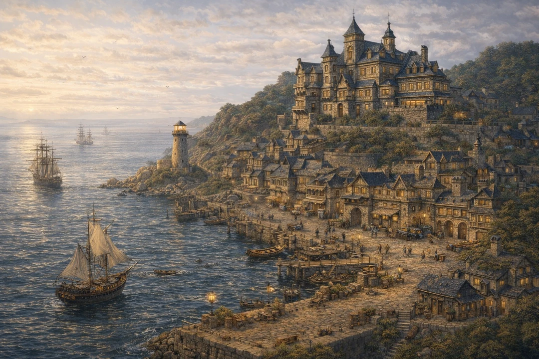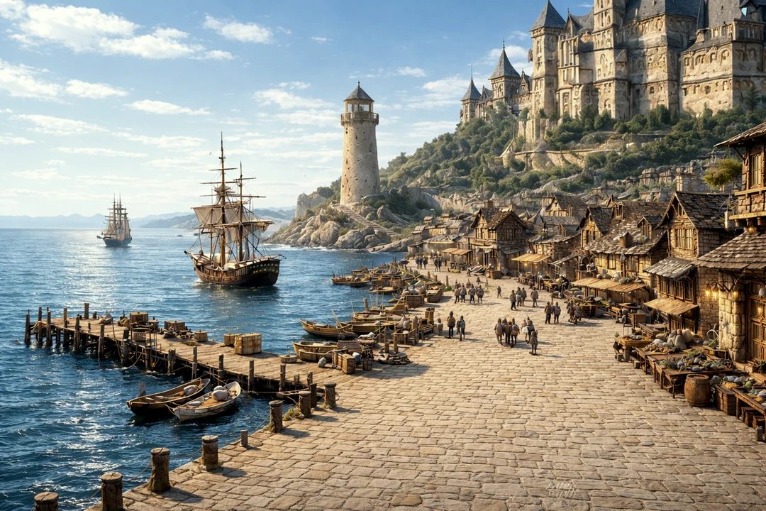 港町リベルタスへ向かう船は、 ゆっくりと西海の 波を割って進んでいた。 潮風は強く、帆は大きく膨らみ、 木造船の甲板はきしむ音を立てる。 遠くの水平線の先には、 やがて石造りの港と 長い防波堤が姿を現す。 高い灯台の炎が昼の光の中でも 静かに揺れ、 その周囲には無数の商船や 漁船が停泊していた。 やがて船は帆を緩め、 ゆっくりと港へ滑り込む。