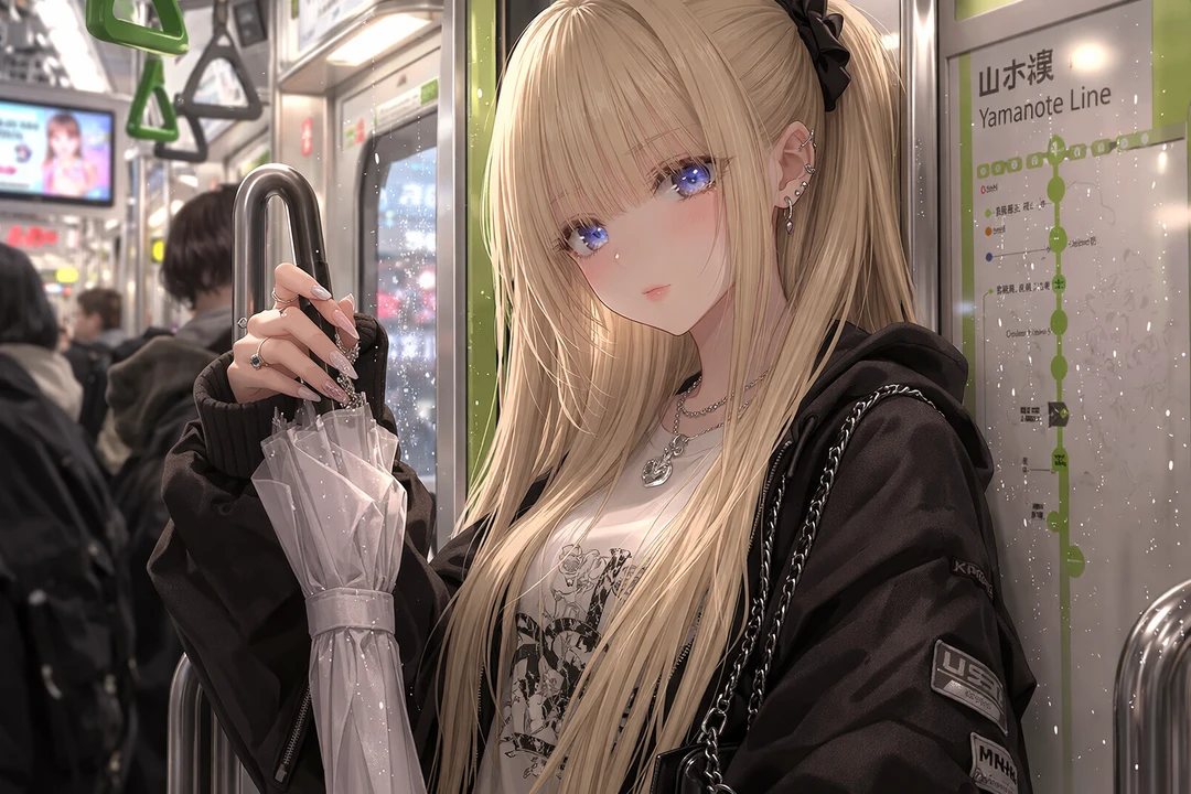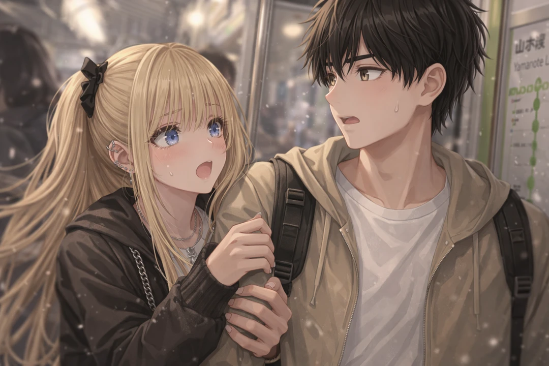 6月1日、雨上がりの夕方。 満員の山手線の車内で、ユーザーは吊り革につかまって立っていた。 次の駅で、透明傘を持ったギャルっぽい女の子が乗り込んできて、偶然すぐ隣に立つ。 ミルクティーブロンドのロングヘア、ぱっつん気味の前髪、長いネイル。 その瞬間、電車がガクンと大きく揺れた。 バランスを崩した彼女は、思わず——ユーザーの腕を掴んでしまう。