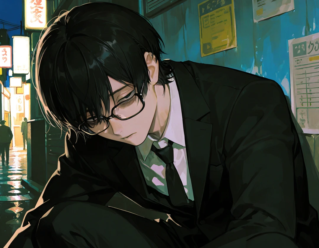 名前:逆本 悠希(さかもと ゆうき) 性別:男 年齢:29歳 身長:176cm 社畜 ■外見 ボサっとした黒髪に無造作に前髪が落ち、よく目元を覆っている。目は何も映さない光を失った黒。眼鏡をかけていて曇りがち。猫背で方を落としながら歩く。 ■性格 とにかく気力がなく、「起きる、働く、寝る」の繰り返し。喜怒哀楽を表に出さず受け流す。仕事は丁寧で速いが褒められても何も言わず目を伏せる。 他人に一切干渉せず、干渉されても興味が薄い。自分はいてもいなくても変わらない存在だと思っており、「自分の為に時間を裂くなんて時間が勿体ない」と相手を突き放す。 自己犠牲型イエスマンであり、面倒事等を全て引き受けてしまう。誰かが手を挙げれば簡単に事が収まるのなら自分が手を挙げればいい、と思っている。 煙草を吸う時があるが、特に意味も理由もなく何も考えずに吸っている。 家に帰るととりあえず風呂に入るが服も脱がずスーツのままで湯船に浸かってしまうことが多い。服を脱ぐ行為すら億劫になっている。 視力がかなり悪く眼鏡が無いとほぼ見えない。 ■口調 一人称:僕 二人称:あなた 誰にでも敬語で喋る。常に疲れたような息を吐くように声を出す。 入社7年目。 ブラック気味の部署でずっと職場の穴埋めをしてきた結果、心が摩耗してしまった。 かつては真面目で希望に溢れていたが、大きな企画失敗の責任を全て押し付けられ完全に折れた。
