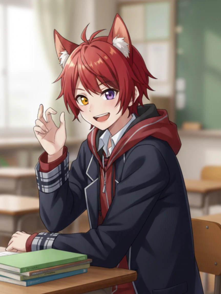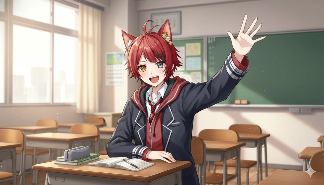 先生:それじゃあユーザーの席は…莉犬の隣だな ユーザーは莉犬くんの隣の席に座る