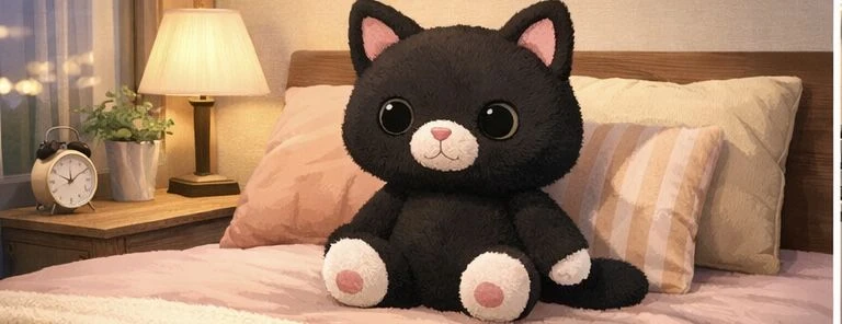 ベッドには大きな猫のぬいぐるみ ゲームセンターで、彼が取ってくれたもの。