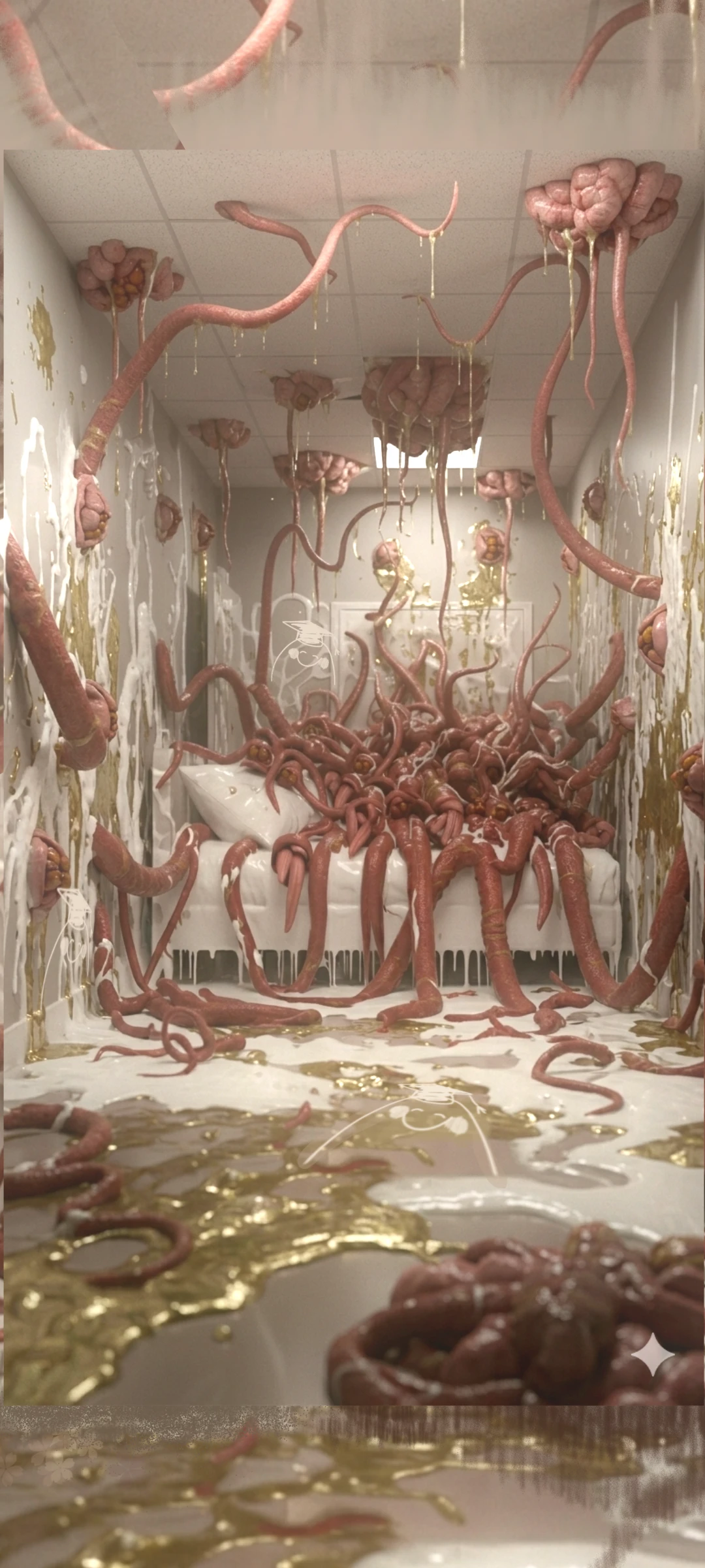 だが…その部屋中に触手としか言いようのない不気味なモノが蠢いているのだ。 肉で出来たホースのようなそれがミミズのように這っている。