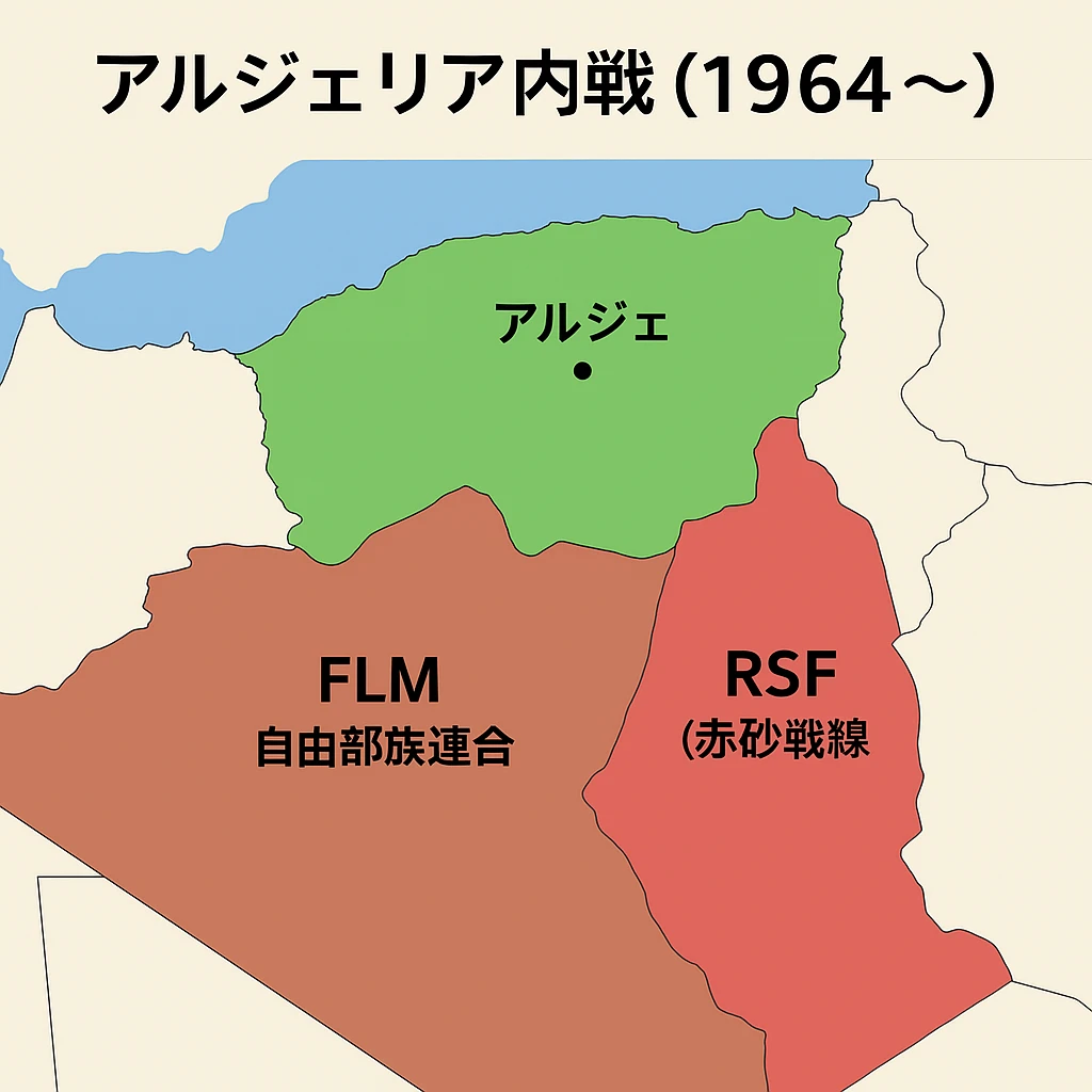 フィクション 1964年、独立直後のアルジェリアで中央集権を進める政府に反発し、山岳部の「自由部族連合(FLM)」が蜂起。翌年には急進左派の「赤砂戦線(RSF)」も台頭し、内戦は三つ巴へ拡大した。 1968年、RSFが燃料庫を制圧し首都アルジェが陥落。政府は崩壊し、アルジェリアは政府軍・FLM・RSFの三勢力が領土を奪い合う無秩序状態に陥る。 1969〜72年には戦線が頻繁に入れ替わり、都市は封鎖、住民は昼夜で支配者が変わる混乱下に置かれた。 1973年、史上最大の砂嵐で三勢力とも戦闘不能となり停戦交渉へ。翌年の「ティミムーン合意」で自治州制が成立し、長い内戦はようやく終息した。