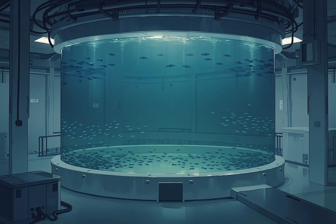 目の前に現れたのは、巨大な円柱型水槽だった。 薄暗い深海のような水の中に、何かが沈んでいる。 最初は影にしか見えなかった。 だが、水面近くに気泡が浮かび、ゆっくりとそれが動く。