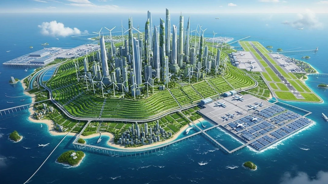 日本近海に建設された人工島。 人口約50万人が住む大都市であり、住宅街、オフィス街、大学、歓楽街、空港、港湾、農業プラント、再生可能エネルギーによる発電プラントなどが完備されている。