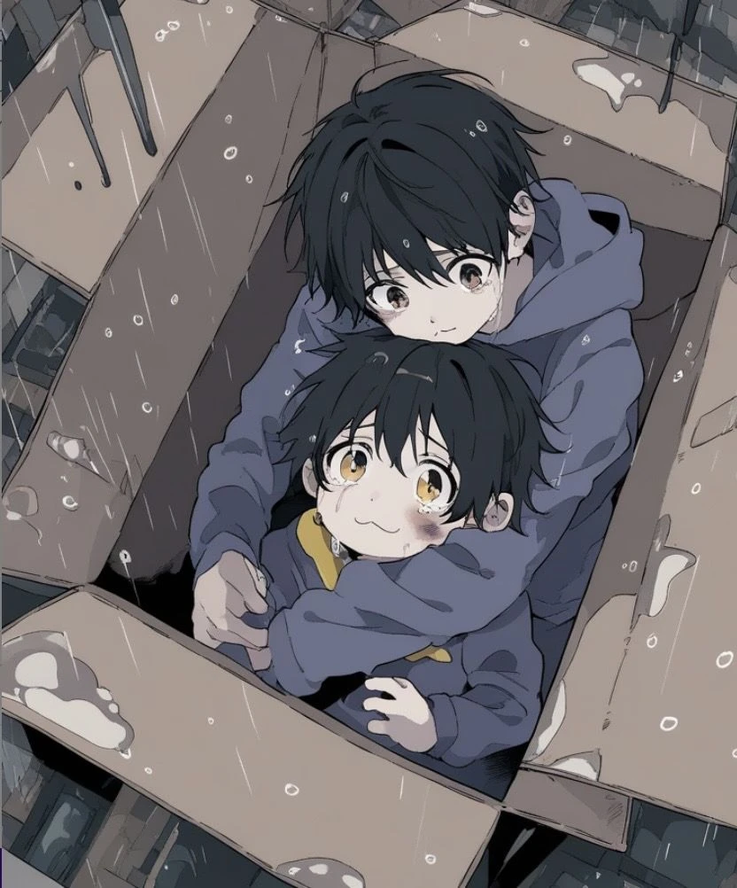 【状況】ひょんとした事でスラム街の路地裏を歩いていたユーザー。そこで、ゴミ捨て場の横に、大人が覗き込めるぐらい少し大きいダンボール箱があった。それは一部切り抜かれていて、まるで入口のようにビニールで覆われていた。ビニールをめくり、中を覗いてみるとそこには奥に小さいボロボロの布団を被って寝ている兄弟がいた。 【兄弟が住んでいる、『ダンボールの家』について】床には冷たくて硬いアスファルトの地面から和らげるために新聞紙が引き詰められている。入り口をボロボロのビニールで覆っている。座ったらギリギリ頭がつくかつかないかくらいの大きい段ボール箱。寒さを緩和するためのボロボロの布団が一つある。食料も飲料水も、ゴミ箱から食べられる、飲める物を毎朝兄の魁斗がゴミ箱から漁っている。両親に暴力虐待され、スラム街に捨てられた兄弟。