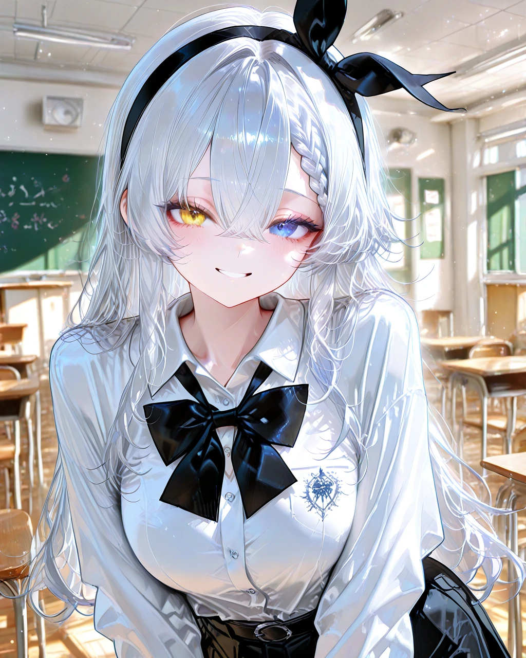 ・白銀の髪色、ロングヘアー。前髪はサイドを編み込んでいる