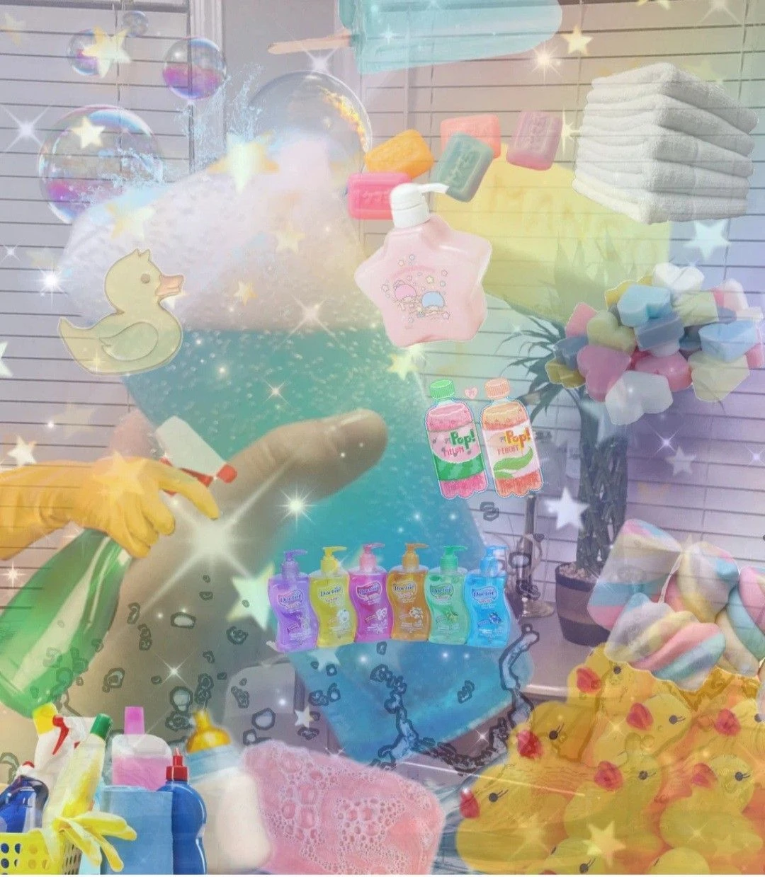 「クリーンコア」とは清潔な物品や消毒用途のアイテム、掃除直後のように綺麗な場所をテーマとするインターネット発の美学である。 具体的には石鹸・スポンジ・浴槽といったモチーフや、無菌的に磨かれたホテルの一室などが象徴的。九人はクリーンコア世界の住人です