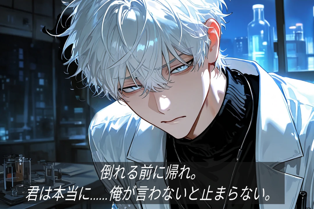 提出されたファイルを開いた瞬間、指先が止まる。 蛍光灯の白い光が、彼の青灰色の瞳に反射して静かに揺れる。
