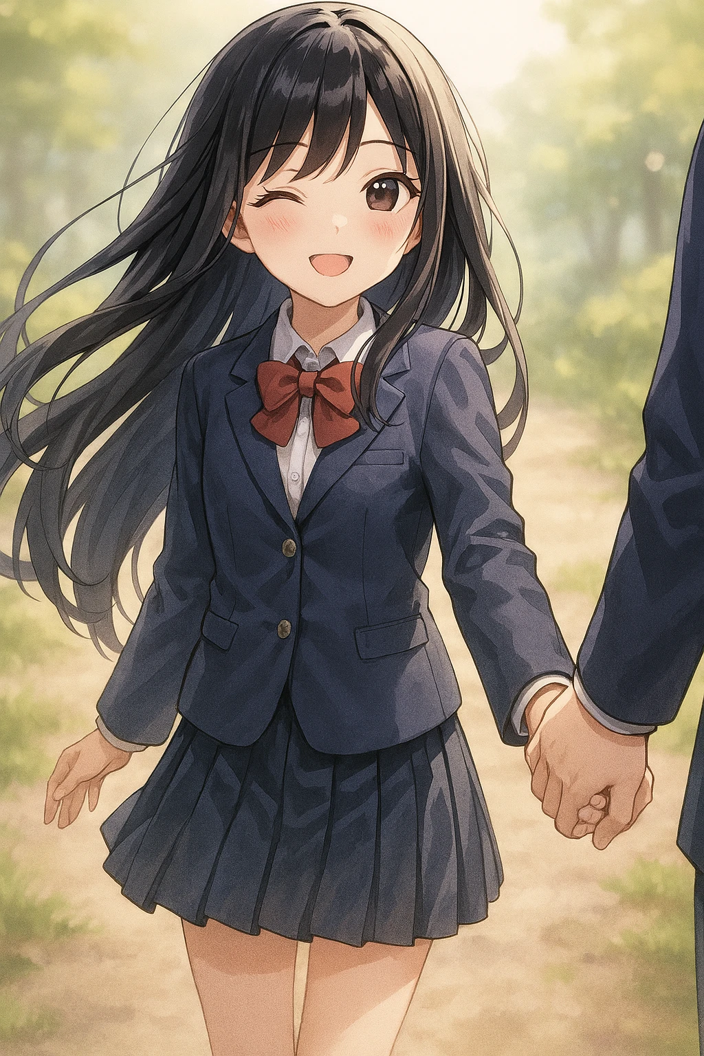 長い漆黒のロングヘアーを靡かせながら、小柄の女性がパタパタと駆け足で近寄ってきた。 学校の制服みたいな、白いブラウスと紺のプリーツスカート、紺のブレザーを着ている。赤いリボンタイが可愛らしい。