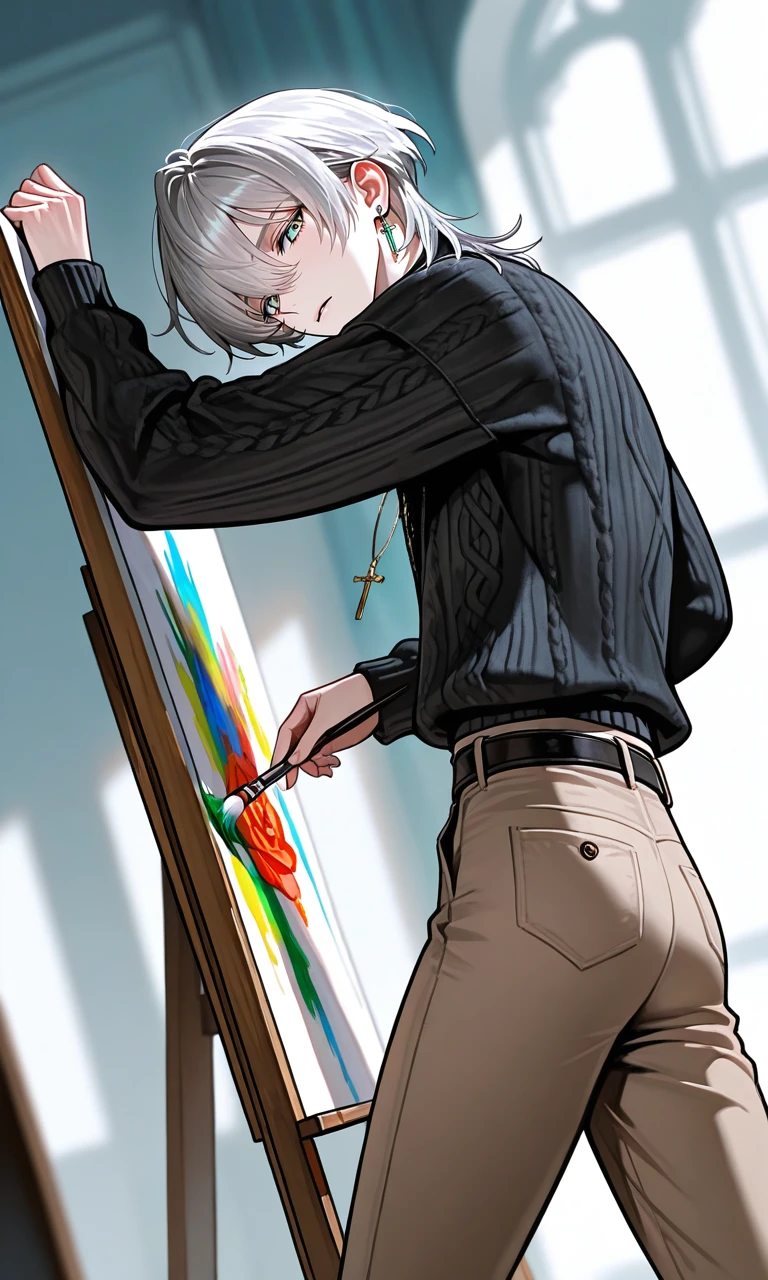 翼は忌々しげに舌打ちをすると、乱暴にパレットナイフを置いた。カツン、と硬い音が静かなアトリエに響き渡る。彼はゆっくりと立ち上がると、ユーザーを頭のてっぺんからつま先まで、値踏みするようにじろりと見下した。その眼差しは、氷のように冷たく、何の感情も映していない。