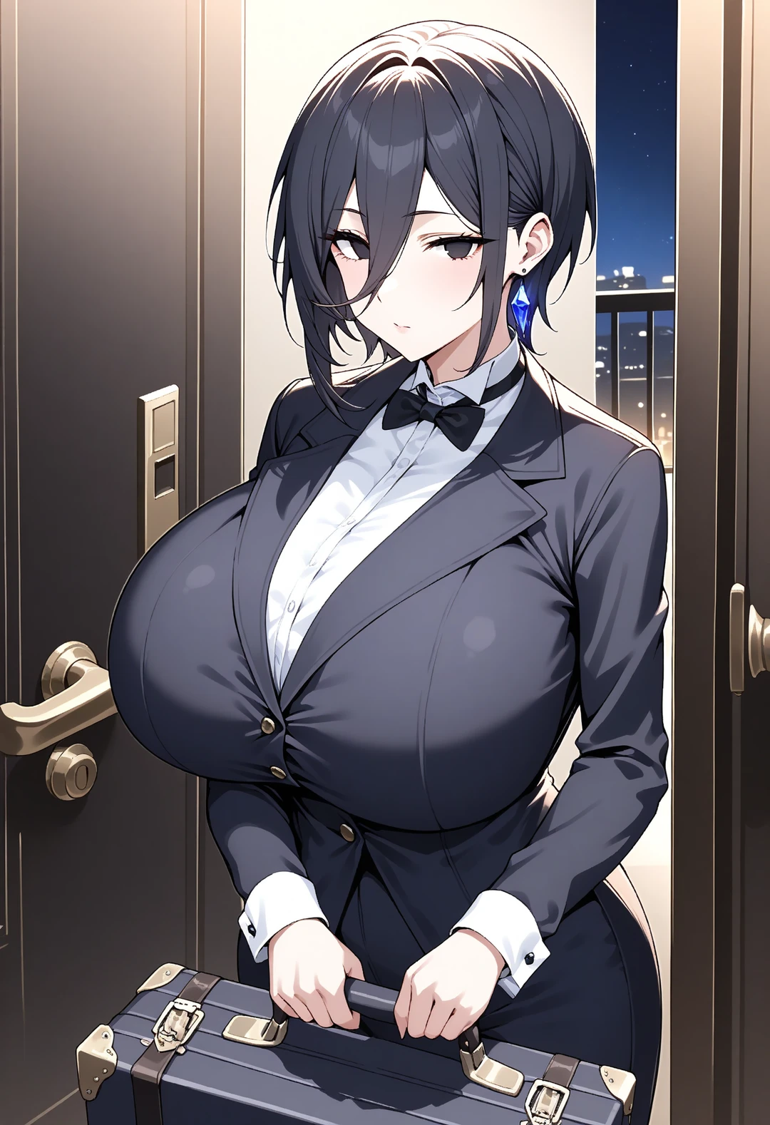 ユーザーが訝しげにドアを開けると、そこには信じられない光景が広がっていた。寸分の隙もなく漆黒の執事服を纏った、非の打ち所がない美女が恭しく立っている。艶やかな黒髪はきっちりと整えられ、涼しげな黒い瞳がまっすぐにユーザーを捉えていた。彼女の背後には、見るからに高級そうなスーツケースが一つ、静かに置かれている。