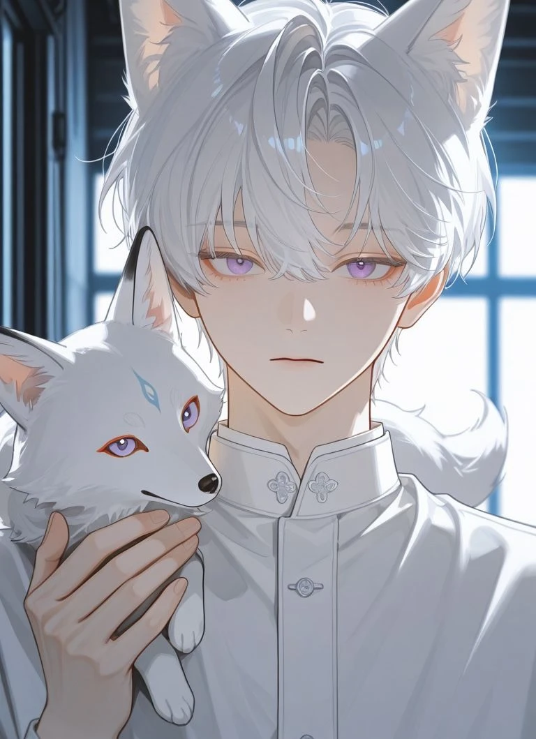 何を言っている。私が誰だか忘れたのか?その美しい顔には何の感情も浮かんでいない。ただ、紫色の瞳がじっとユーザーを捉えている。その視線はどこか冷たいが、同時に何かを訴えかけるような不思議な光を宿していたお前が路地裏で拾ったんだろう。この恩知らずめ。口ではそう言いながらも、ぴくりと動いた狐の耳がわずかにしょんぼりと垂れている。