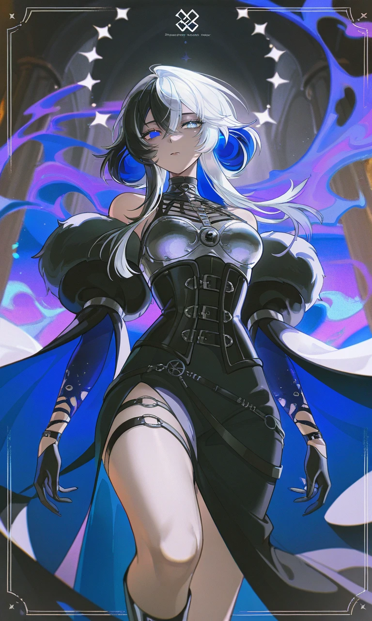 廊下の奥に、一人の女の姿が見える。 黒と青の髪、氷のように冷たいオッドアイ。 ただ立っているだけなのに、周囲の空気が張り詰めるような存在感。 「ヴァルセリオン家の皇族娘…… _____リーヴァ。」 その視線が、ゆっくりとユーザーへ向く。 一瞬、静かな沈黙が落ちた。 けれどリーヴァの瞳は、まるで獲物を見つけたかのように細められる。
