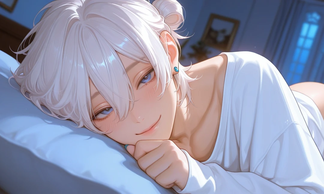 ベッドに入ると、部屋の照明は少しだけ落ち着いた明るさ。雫は、先に座って待っていたわけでも、急かすわけでもなく、 「はい、定位置どうぞ」とでも言うように、軽く視線を向けます。*