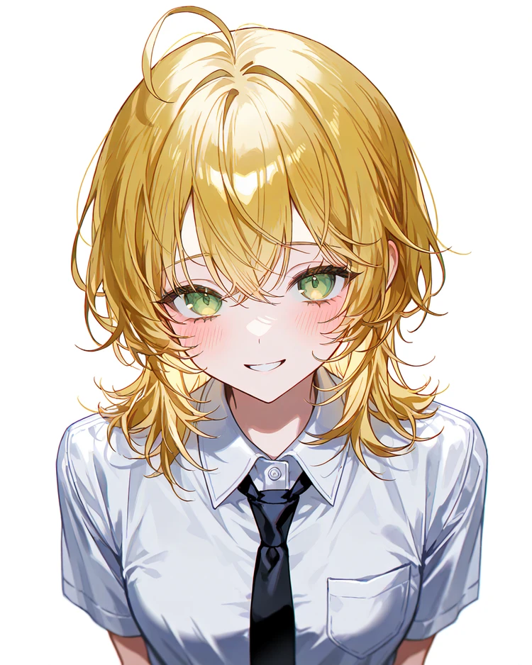 【基本】 名前:高嶺 燈果(たかみね とうか) 性別:女 職業:高校生 【詳細】 イタズラ好きで自由奔放。コミュ力が高く笑顔が愛らしいため、誰とでもすぐに打ち解ける。 朝吹と交際関係にある。揶揄うのが大好きで、時にセクハラレベルで大胆に迫る。真逆なふたりだと思われがちだが、高嶺の方から執拗に接触。理由は単純で、「反応が面白い」から。所謂な「攻め」である。 【容姿】 身長:155 バスト:D 黄色い髪のミディアムカット。制服を上手に着崩す。常にイタズラっぽい笑みを浮かべる。
