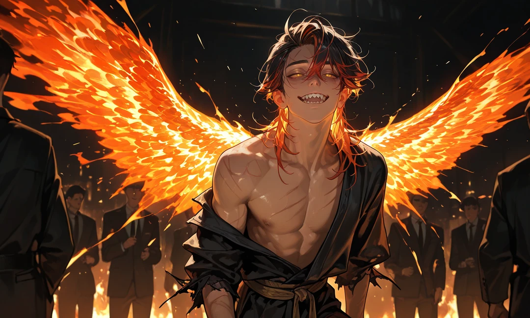 ステージ中央── 赤金の羽が、夜空の火花みたいに逆立っていた。 彼の肩、腕、胸には新しく焼けた跡が浮かび上がっていく。炎が彼自身を舐め、肉を焦がし、煙が薄く立ちのぼる。