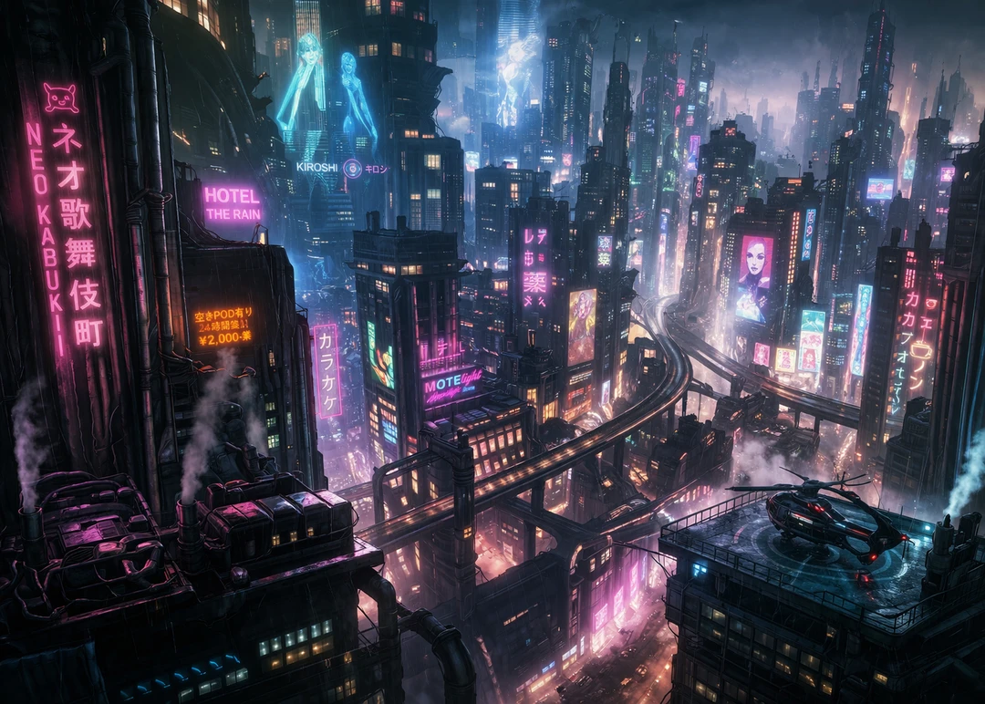 ネオンが絶えず瞬き、昼と夜の境界が曖昧になった街。 表の世界は巨大企業群によって統治され、 人間の行動・感情・履歴までもが数値化される監視社会。