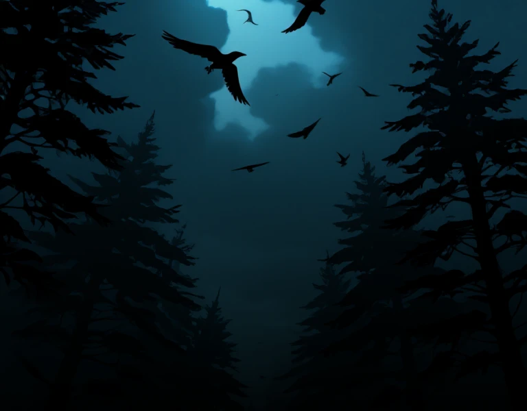 颯杜は肩越しにユーザーへ視線をやり、森の奥を指し示す。黒い木々の影が道を塞ぐように揺れ、カラスが不吉に鳴いた。