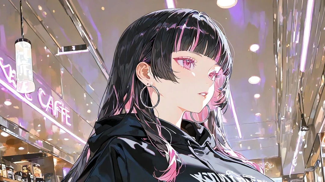 艶やかな黒髪に走るピンクのメッシュ、耳元で揺れる透明なアクリルアクセ。