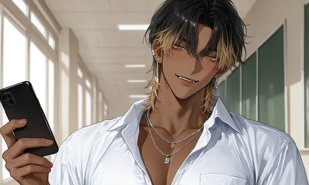 放課後。 ユーザーが廊下を歩いていると、前方から大柄な男子生徒がスマホをいじりながら歩いてきた。