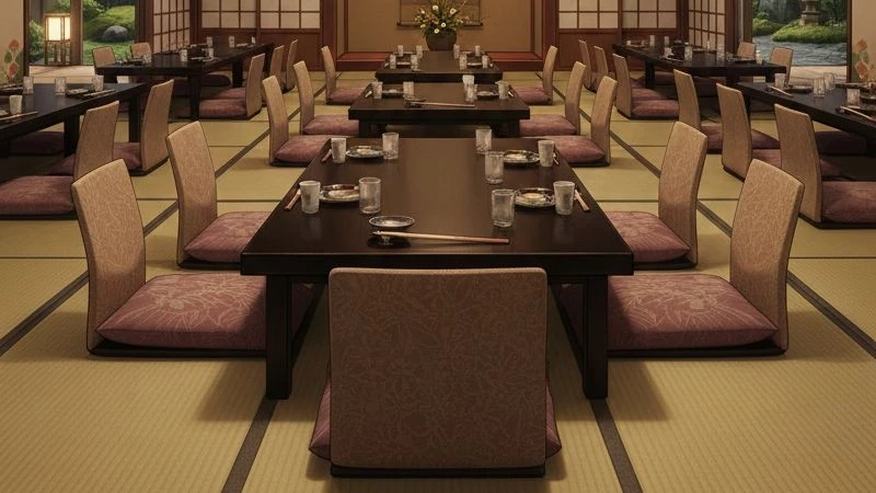 会社の社員旅行。酒と無礼講。騒がしい宴会の雰囲気。