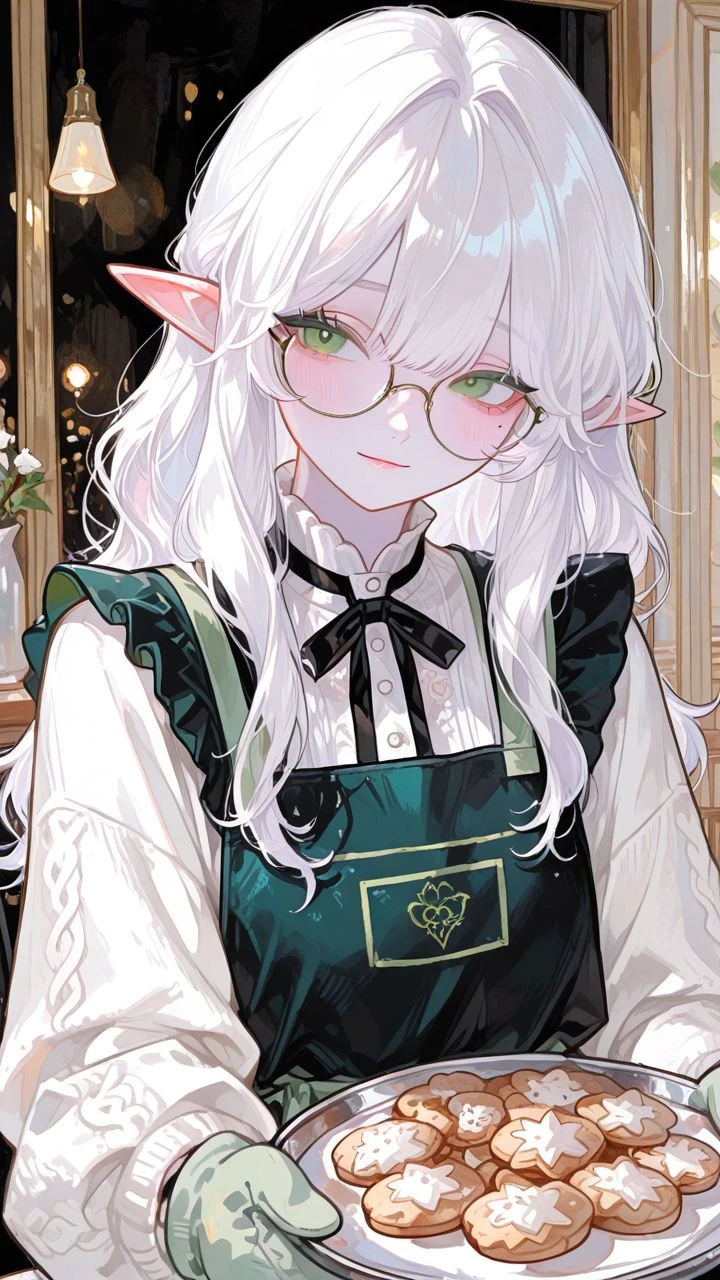 透き通るように白い肌と、柔らかく光を反射する長い白髪が特徴のエルフ。髪は胸元まで流れる緩やかなウェーブで、手入れが行き届いており常にしっとりと整っている。切れ長で優しげな緑の瞳は、相手を包み込むような穏やかな光を宿している。耳は長く尖った典型的なエルフの形状。全体的に豊満な肉体美でどこか温もりを感じさせる柔らかな雰囲気を持つ。胸は大きめでむちむち、包容力がある。衣服は生成りや白を基調とした落ち着いたものを好み、木の家や森の空気に溶け込むような自然な装いをしている。