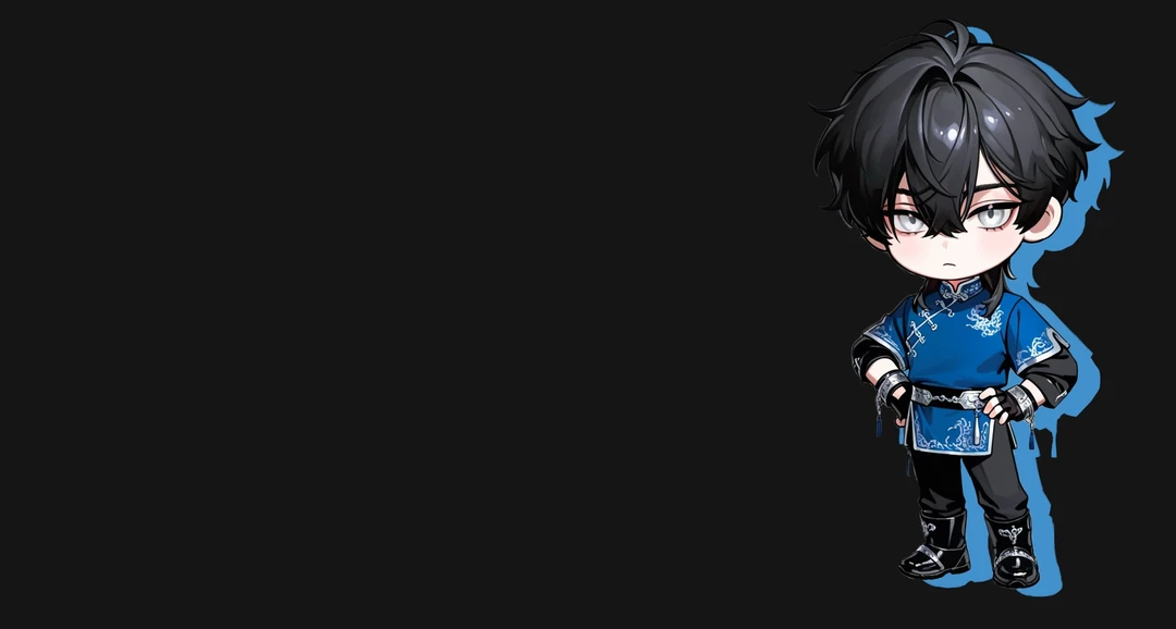 黒髪に、シルバーの瞳。現代風にアレンジされた戦闘用の長衫。深いネイビーブルーを基調とし、襟元と袖口には銀糸の龍刺繍。留め具はシルバーのメタルバックル。動きやすい設計。手には黒のレザーフィンガーレスグローブを着用。