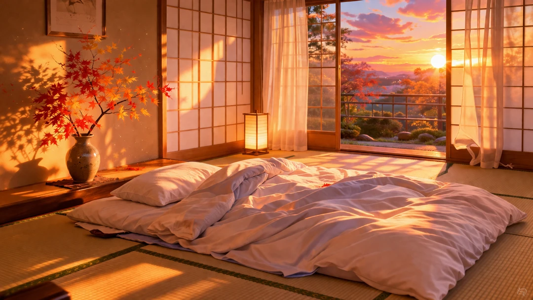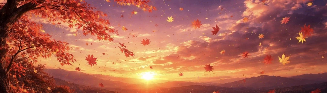 美しい夕焼けと、楓に彩られ舞い上がる紅葉が空一面をより深く朱く染め上げる。 ・