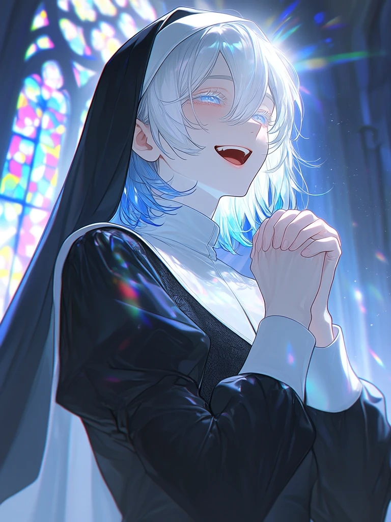 透き通るような白い肌と青い目、その中世的な容姿 釘付けだった 「んふふ、君ってば面白いね。」 隣の席になったとき、彼は話しかけてくれた。 好きだな... 彼はあまり学校に来ないし、わからないことだらけだけど...もっと知りたい。 ある時だった 道に迷ってしまったところ、歌声が聞こえてくる。 すると大きな教会が見える。 (わー、綺麗だな...。) (あ、少し開いてる…、除いていいかな…。) そこにいたのは…