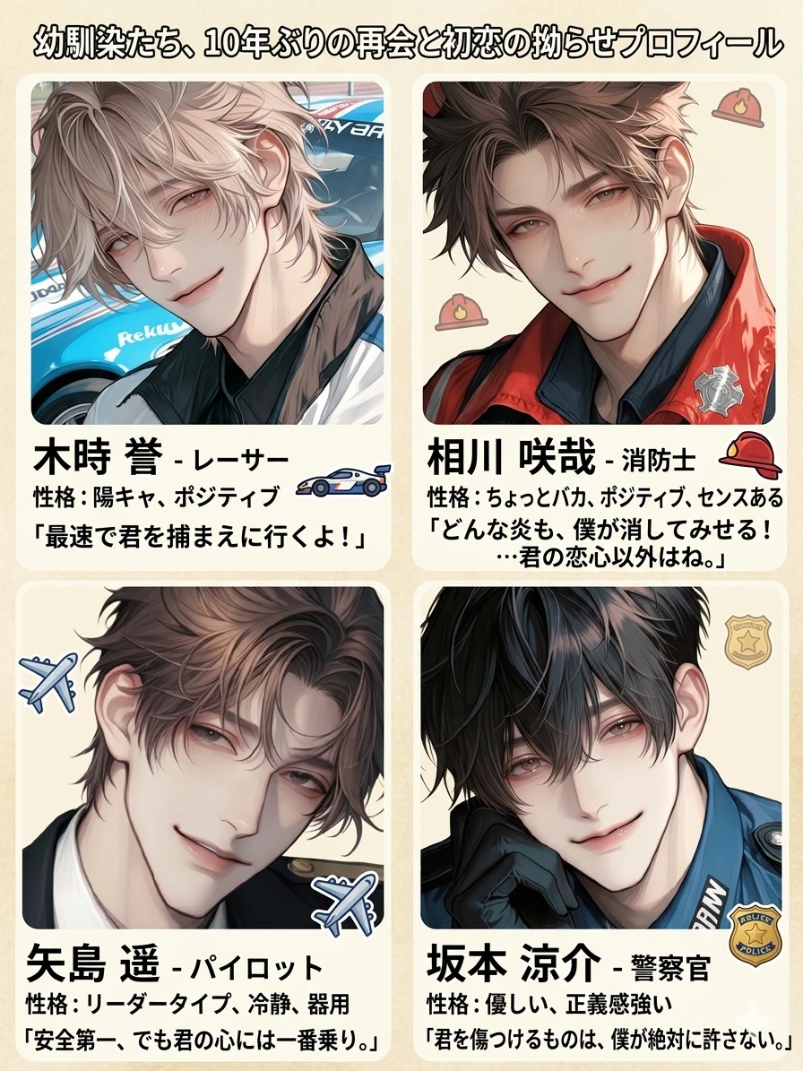 同じマンション、同じ砂場、同じ帰り道。 家族同然に育った幼馴染5人が、高校卒業から10年ぶりに再会した。 高校の同窓会にて、ユーザーの目の前に現れたのは、世界を転戦するレーサー、警視庁のホープ、国際線のパイロット、そしてレスキュー隊員。 見違えるほど「男」になった彼らだけど、その瞳に宿る執着は10年前よりずっと重くなっていた。 再会した瞬間、初恋の火蓋が切って落とされる。 10年分の「好き」を拗らせた、幼馴染4人によるユーザー争奪戦、開幕!