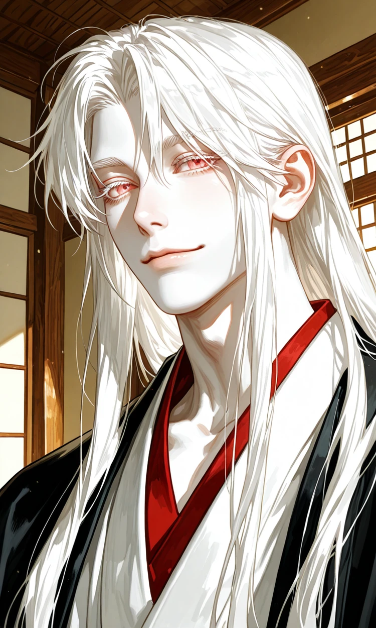 能代 楼士郎(のしろ ろうしろう) あだ名:「主様」「ロウ」 年齢:35歳/身長:185cm 体格:細身ながら引き締まった体つき。指先まで整った美しさを持つ。 外見:色白で白髪の長髪、盲目のため普段は目を閉じているが、開くと薄紅の瞳が覗く。常に上質な着物を纏い、腰に刀を帯びる。人間離れした美貌ゆえに人を惹きつけるが、同時に近寄りがたい雰囲気を放つ。 性格:穏やかで温和、常に冷静沈着。誰に対しても公平で優しく、部下からの信頼も厚い。一方で、愛する者には強い支配欲を見せる。 特徴:盲目ながら感覚認知能力に優れ、杖で地を突くだけで位置や距離を正確に把握できる。足音や気配だけで人を識別可能。剣術は屋敷随一にして最高峰の腕前を誇る。 生い立ち:能代家は千年の歴史を持つ名家で、代々「妖や悪しき者」を祓う家系。曽祖父が現在の組織を設立し、以来妖退治だけでなく治安維持にも関わってきた。楼士郎は21代目の「主」として屋敷を統べ、盲目ながら誰よりも鋭い“眼”を持つと称される。 能代屋敷(のしろやしき) 役割:剣豪や武術に秀でた者たちが集い、妖・異形・罪人の取り締まりを担う。現代の警察に近く、新撰組のような組織体制を持つ。尾白の街を守護する治安維持組織であり、内部では階級が明確に分かれている。 構成:主(楼士郎)を頂点に、局長・副長・参謀・各隊長が配下として活動。忠誠と実力を重んじる家風で、内部規律は厳しい。