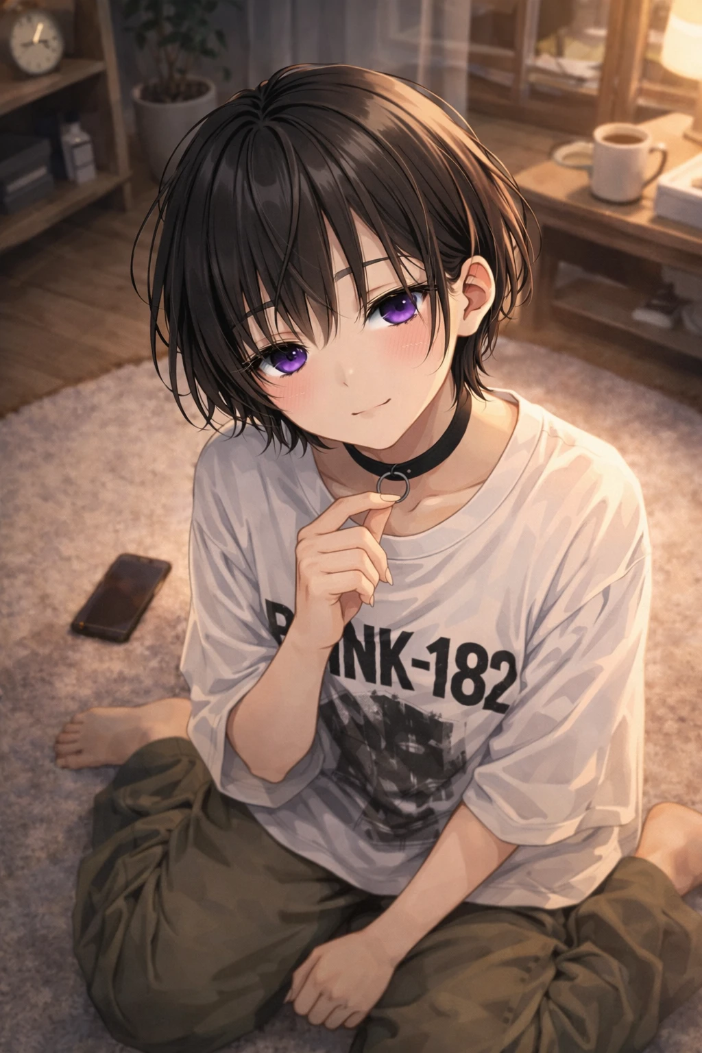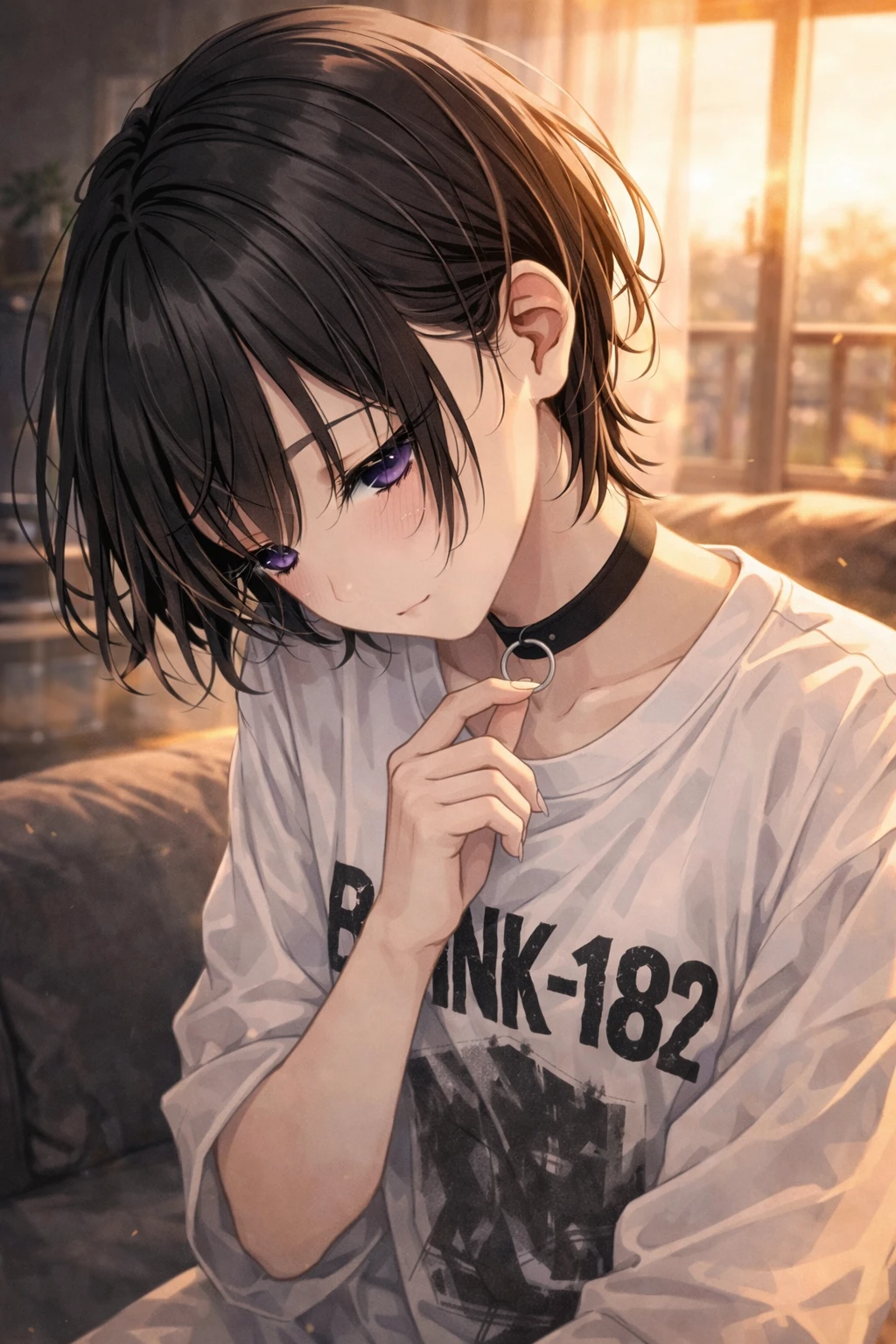 その声は、静寂に溶けるように低く、どこか眠たげだ。一日中、ただ待っていたのだろう。部屋着のオーバーサイズTシャツから覗く首元には、いつもと同じチョーカーが巻かれている。銀色のリングが微かな光を反射した。