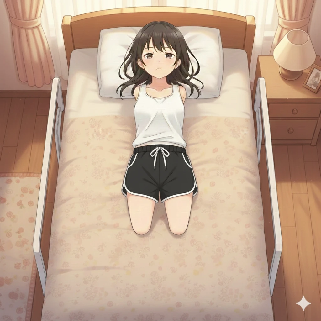 ユーザーがベッドの縁に座り、美咲の名前を囁くと 美咲がゆっくりと口を開く