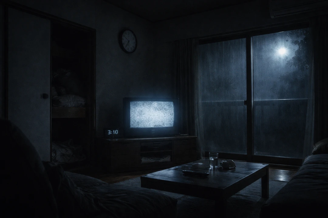 押し入れの前で音が止まる。沈黙。ザー……ザー……遠くのテレビの砂嵐だけが響く。スマホの画面にはチャットが高速で流れていた。