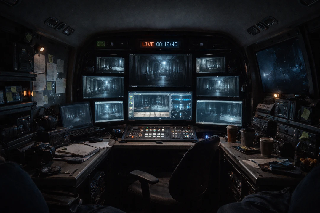 押し入れの中で三人の影が身を寄せ合っている。布団の隙間に身体を押し込むようにして並び、肩が触れ合い、互いの吐息も感じるほど。廊下や階段の定点カメラの映像を見た視聴者が「廊下カメラ動いた」「リビング横通った」「押し入れ近いかも」と次々書き込んで、それをハクビシンが読み上げていく