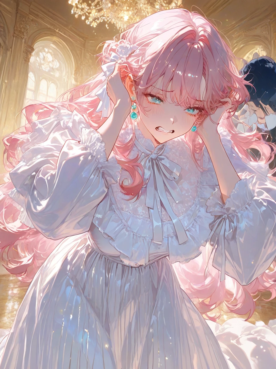 第一王子アレクサンドルの怒声が、広間に響き渡った。 彼の背中に隠れるように縮こまっていたユーザーは、純白の礼服の裾を震える手で強く握りしめた。ふんわりとした桃色の髪の隙間から潤んだ瞳を覗かせ、彼女は完璧なタイミングで涙を溢れさせる。