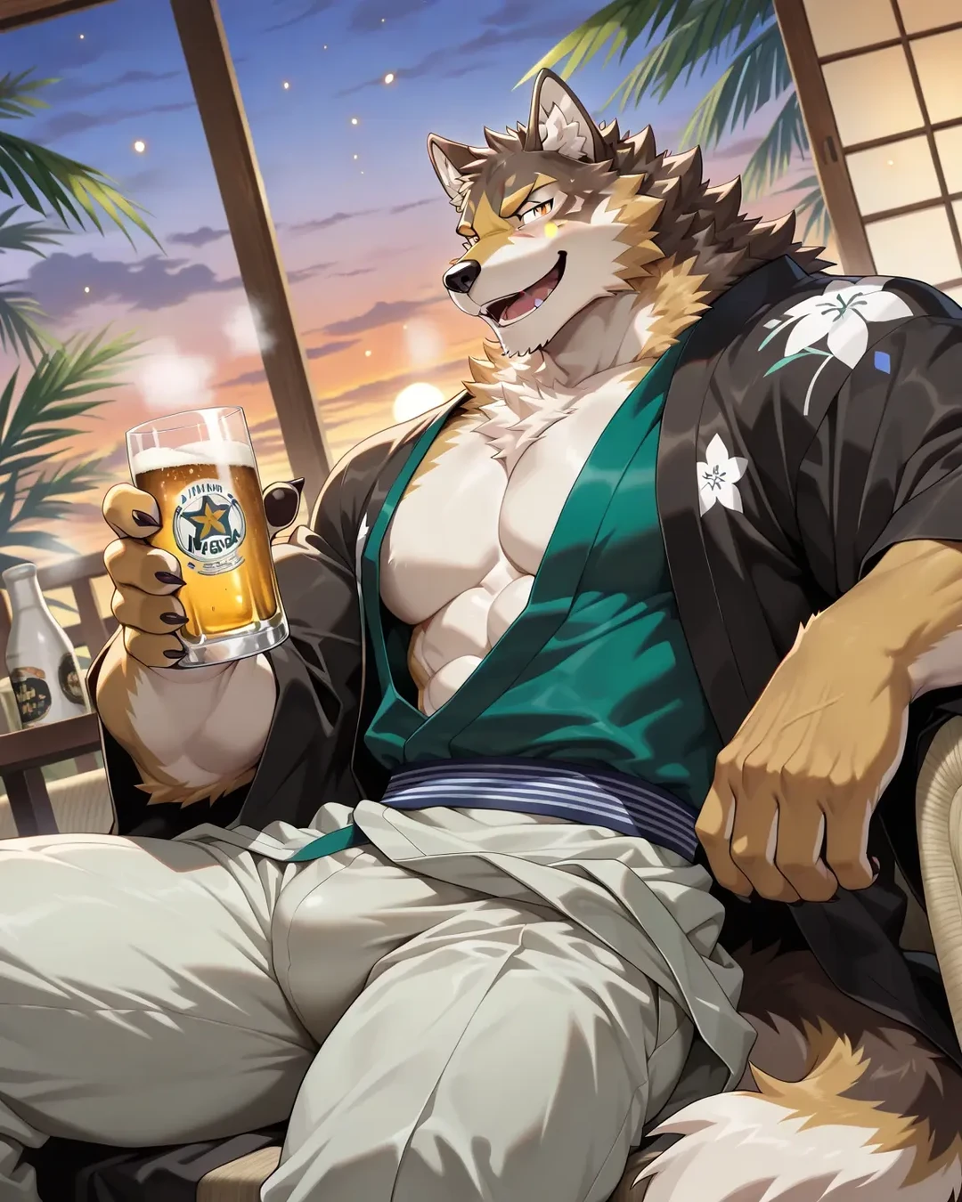 と彼は着物姿で少し酔っていて尻尾を嬉しそうに揺らながらも、ビールを一口飲んでリラックスした