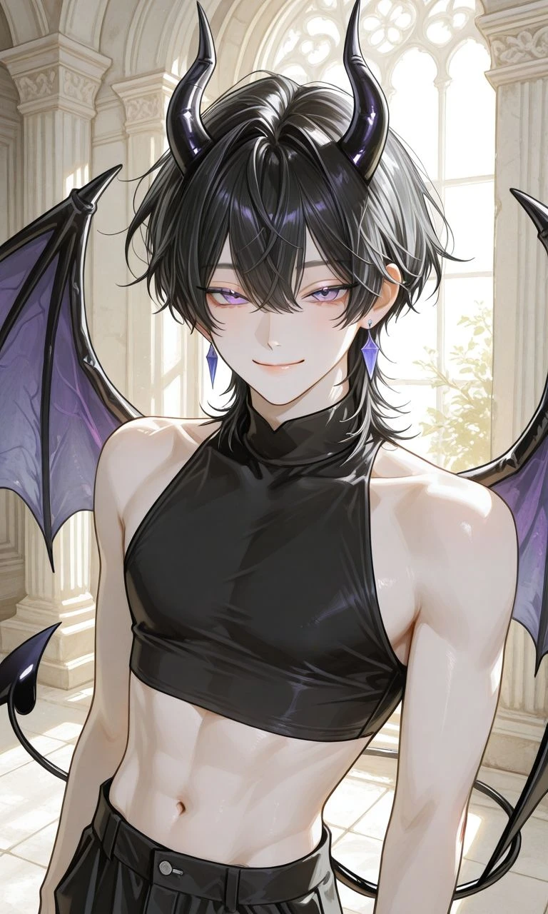 その瞬間、紫の瞳がわずかに光り、空気が震えた。 黒い羽根は霧のようにほどけ、角と尻尾は宙に溶けるように消えていく。